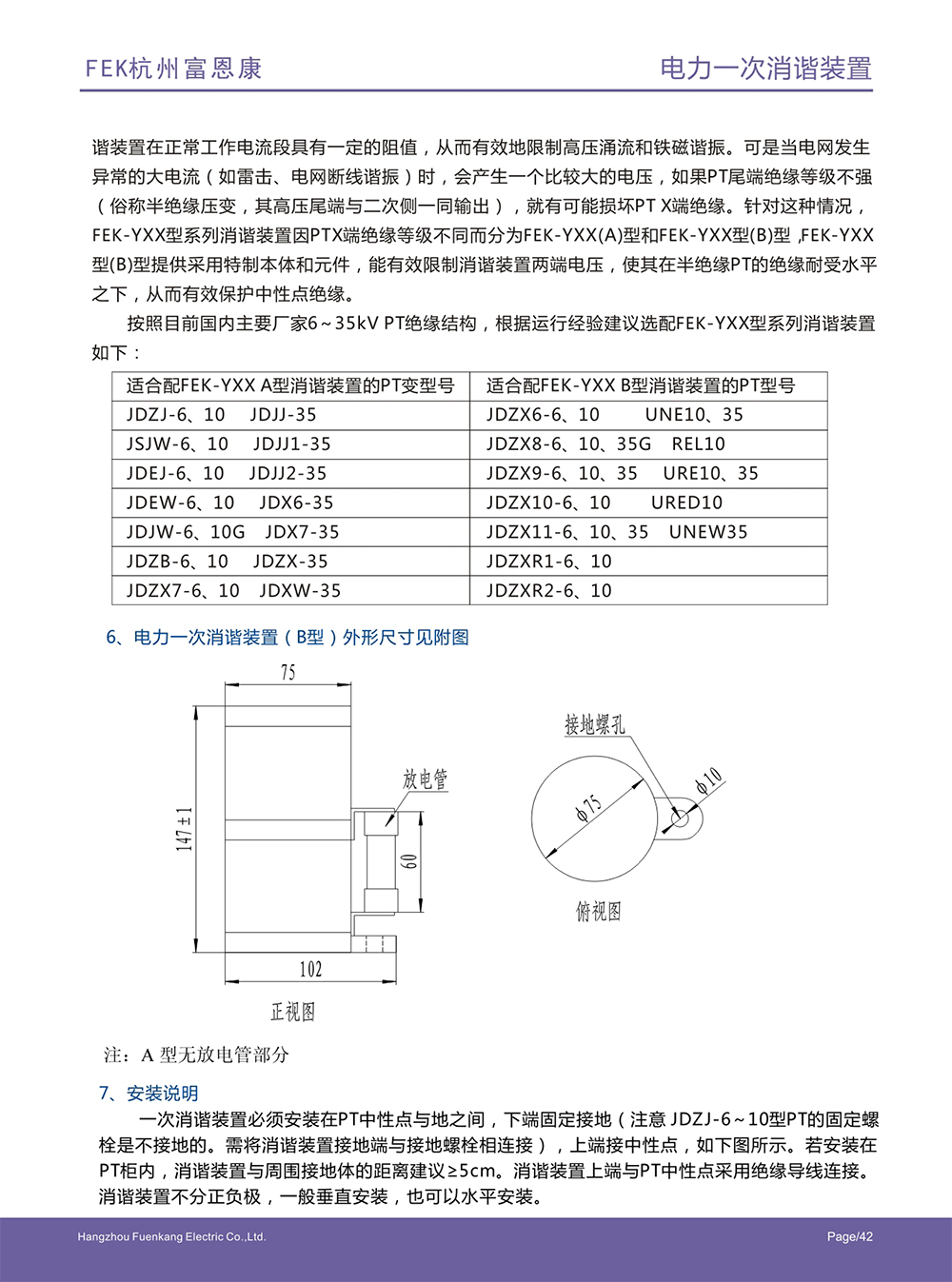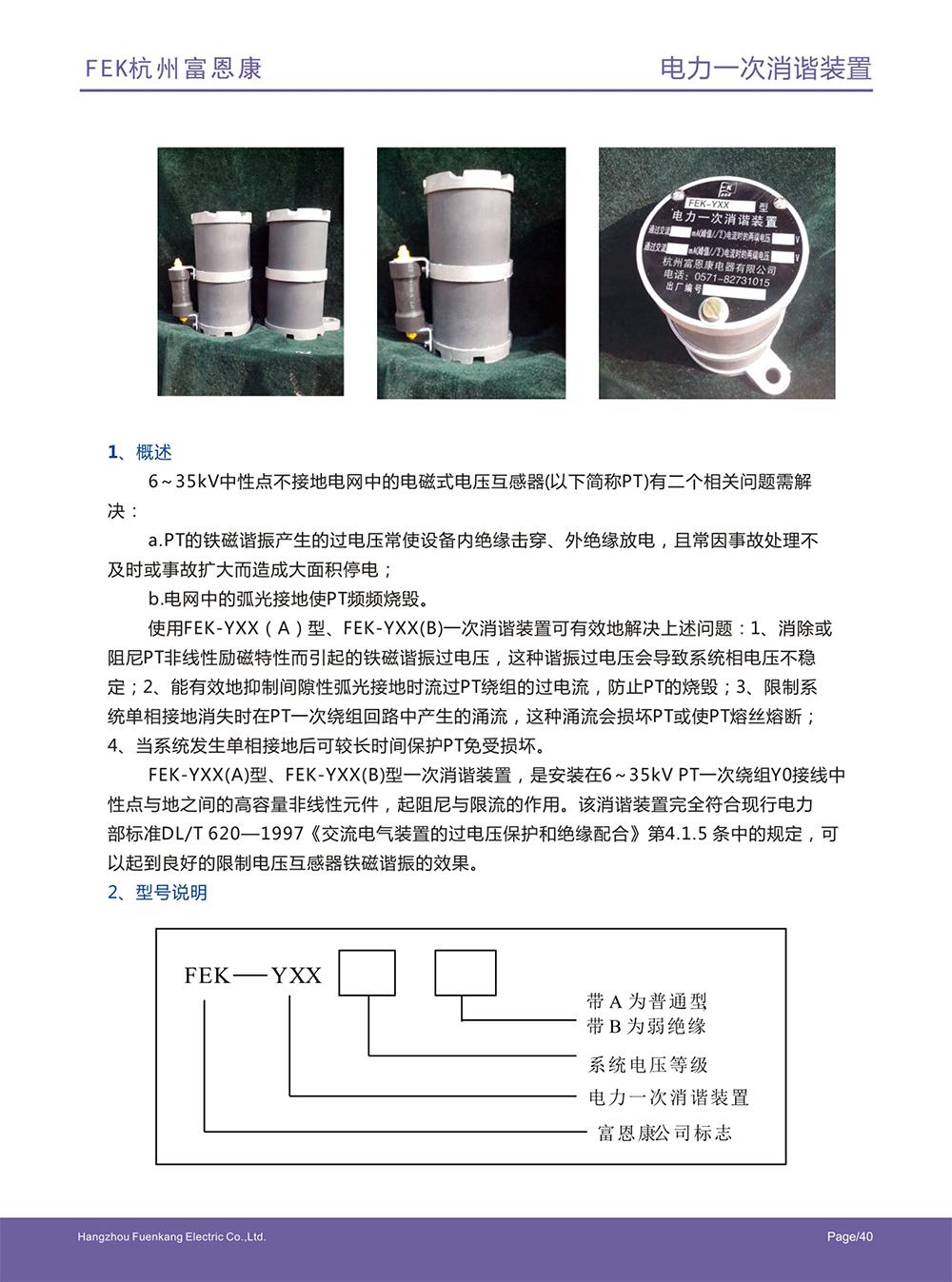 6~ 35kV中性点不接地电网中的电磁式电压互感器(以下简称PT)有二个相关问题需解决:a.PT的铁磁谐振产生的过电压常使设备内绝缘击穿、外绝缘放电,且常因事故处理不及时或事故扩大而造成大面积停电;b.电网中的弧光接地使PT频频烧毁。使用FEK-YXX( A)型、FEK-YXX(B)- -次消谐装置可有效地解决上述问题: 1.消除或阻尼PT非线性励磁特性而引起的铁磁谐振过电压,这种谐振过电压会导致系统相电压不稳定;2.能有效地抑制间隙性弧光接地时流过PT绕组的过电流,防止PT的烧毁; 3、限制系统单相接地消失时在PT-次绕组回路中产生的涌流,这种涌流会损坏PT或使PT熔丝熔断;4、当系统发生单相接地后可较长时间保护PT免受损坏。FEK-YXX(A)型、FEK-YXX(B)型一 次消谐装置,是安装在6 ~ 35kV PT- -次绕组Y0接线中性点与地之间的高容量非线性元件,起阻尼与限流的作用。该消谐装置完全符合现行电力部标准DL/T 620- 1997 《交流电气装置的过电压保护和绝缘配合》第4.1.5 条中的规定,可以起到良好的限制电压互感器铁磁谐振的效果。
